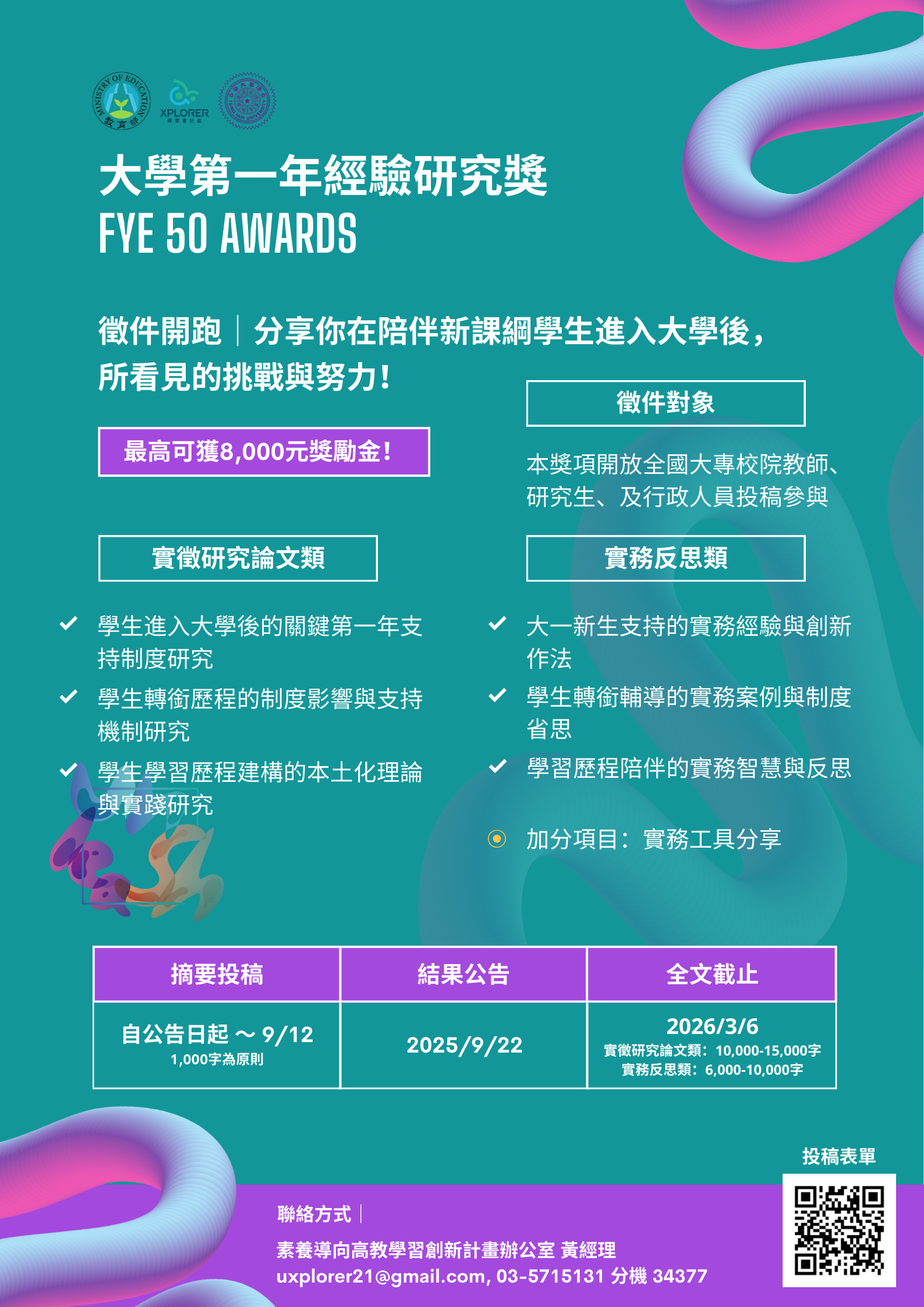 三、「大學第一年經驗研究獎」摘要論文徵件期程自公告日起至本(114)年9月12日下午17時止受理申請。有意申請者,務請詳閱該計畫粉絲專頁公告,網址:https://www.facebook.com/nthu.xplorer。