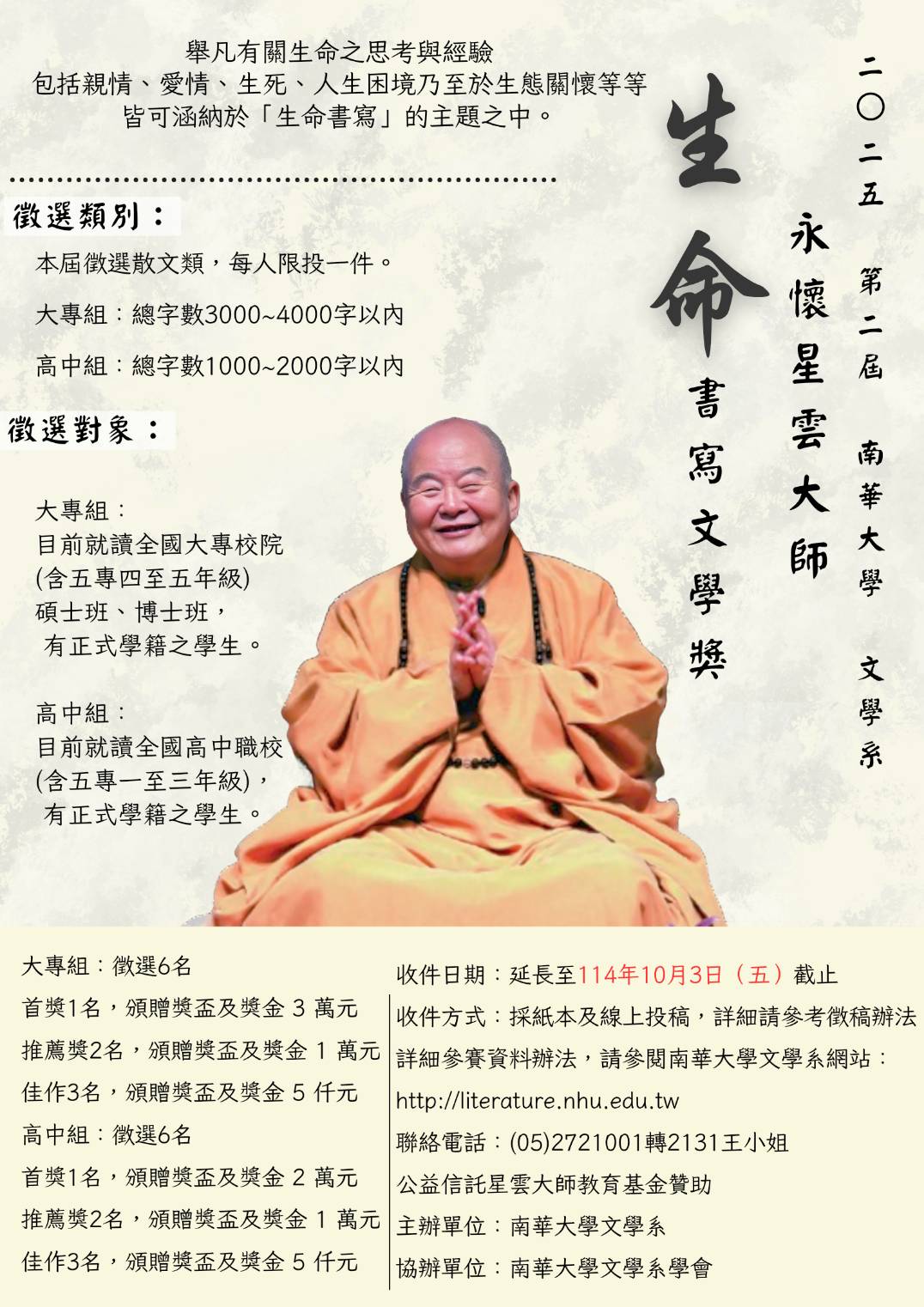 南華大學「2025第二屆永懷星雲大師——生命書寫文學獎」活動延長徵稿至114年10月3日