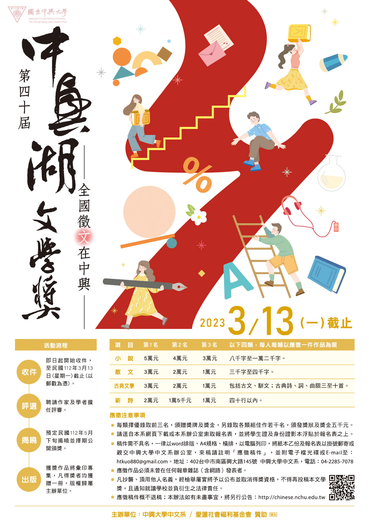 國立中興大學中文系辦理「國立中興大學第40屆中興湖文學獎全國徵文比賽」,敬請踴躍投稿。